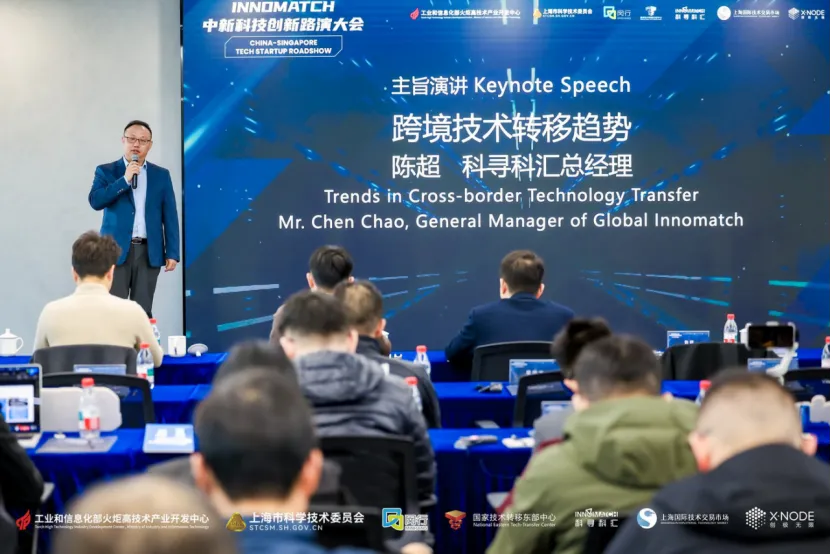 主旨演讲环节,科寻科汇(上海)科技服务有限公司总经理陈超先生围绕《跨境技术转移趋势》展开深度分享。他指出,数在全球化格局深度调整的今天,跨境技术转移已成为驱动经济高质量发展的关键战略力量,其核心驱动力正来自数字化技术对创新要素连接方式的重构,高效的数字化解决方案,成为链接全球创新资源的重要枢纽。陈超先生特别强调了对与新加坡深化合作的期许,期待双方在技术转移、平台共建与人才培养方面取得更丰硕成果。