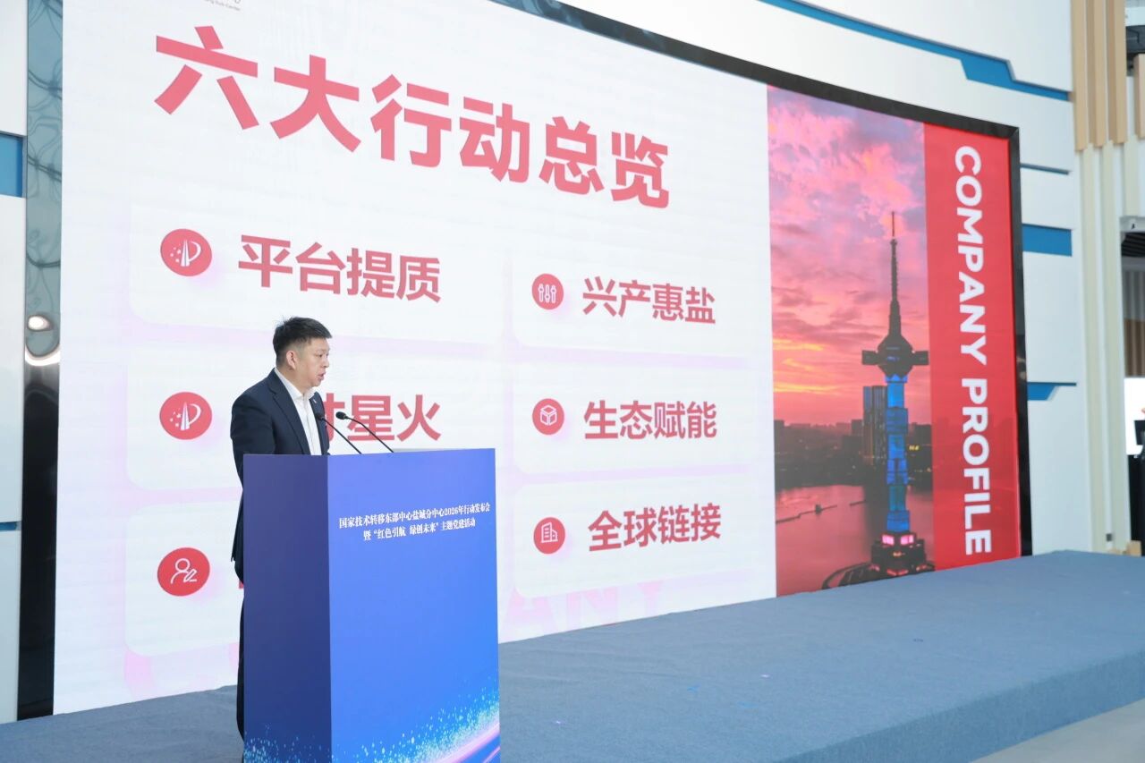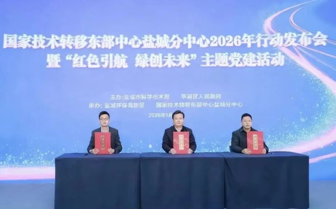 2026年1月12日,“2026年行动发布会暨‘红色引航 绿创未来’主题党建活动”于国家技术转移东部中心盐城分中心圆满举行。本次活动由盐城环保高新区、国家技术转移东部中心盐城分中心承办,汇聚了沪盐两地政府领导、高校专家、金融机构及各企业代表,共同擘画盐城科技创新与成果转化新蓝图,吹响了“十五五”时期盐城建设长三角北翼科创高地的奋进号角。